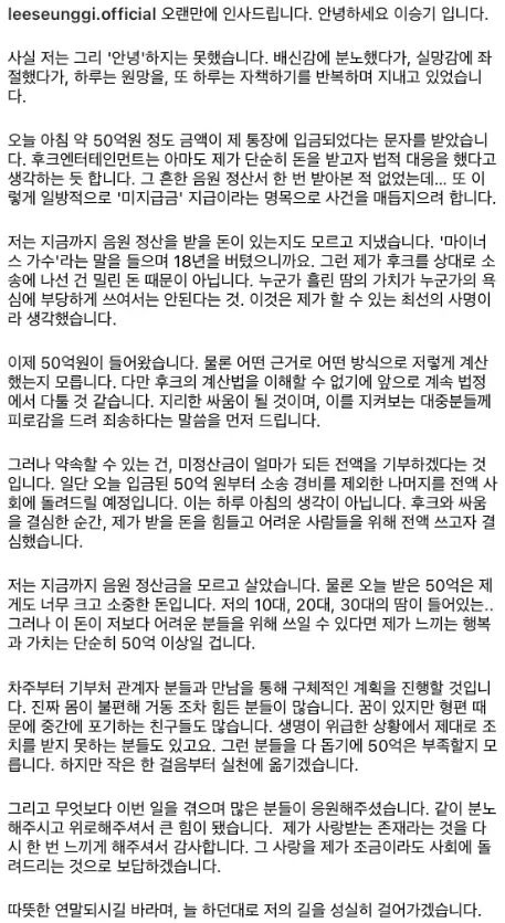 최근 음원정산 문제로 후크엔터테이먼트와 법정 싸움을 하고 있는 이승기가 음원정산으로 받은 50억을 소송비용을 제외하고 기부하기로 밝혔습니다.